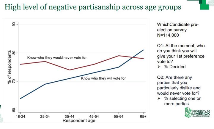 Levels of partisanship are low in Ireland in comparison to other western European democracies. This does not necessarily imply that Irish voters are apathetic: for instance, voters can hold strong negative views of particular parties, even if they lack a positive party attachment. Negative partisanship has been found to be an important driver of vote choice in other contexts. Drawing on international research, we categorise voters as open partisans, negative partisans, closed partisans or apathetic. We measure the prevalence of each type of voter in Ireland using data from the 2024 National Election and Democracy Study, and examine the impact of this on political behaviour, including turnout and vote choice. In particular, we test whether holding negative views of a given party increases the likelihood of voting for ideologically opposing parties, or whether it increases the likelihood of voting for that parties’ main rivals for government.